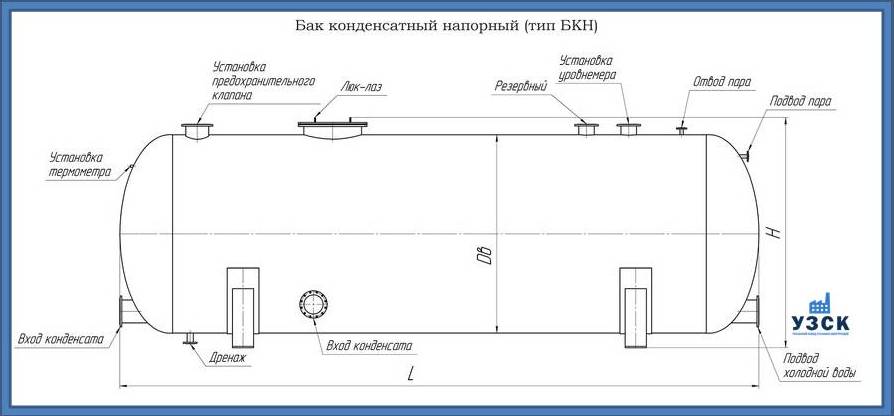 Конденсатный бак в котельной может быть атмосферным (БКА), с внутренним давлением до 0,07 МПа, и напорным (БКН), избыточное давление внутри 0,6 МПа. Именно, в напорном баке происходит вторичный отбор пара пониженных параметров.