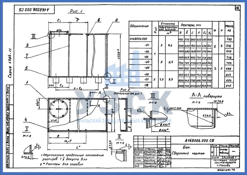 | 6 | Бак прямоугольный | А16В 099.000 | 3 | 1100 | 2000 | 1508 | серия 5.904-43 | 407,4кг |