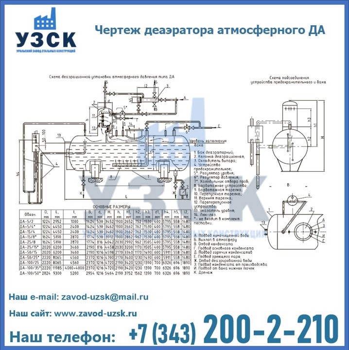 Приобрести качественное оборудование, в том числе, деаэраторы ДА, можно в компании УЗСК в Копейске. Мы предлагаем долговечную и надежную продукцию по приемлемой цене. Заказать и купить деаэраторы или другие изделия высокого качества можно через сайт Уральского Завода Стальных Конструкций, или позвонив по указанному в разделе «Контакты» телефону.